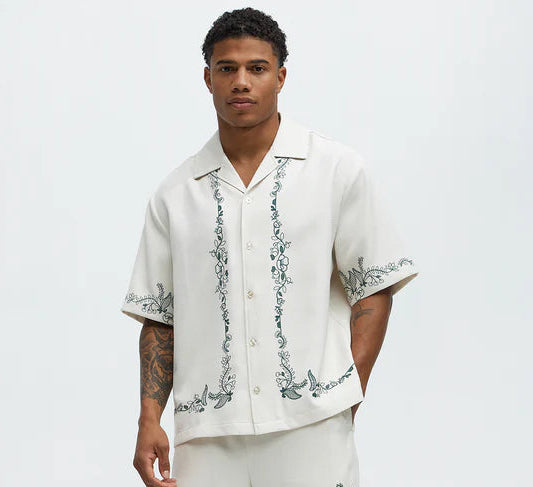 Wine Border Hand Embroidered Cuban Shirt - White